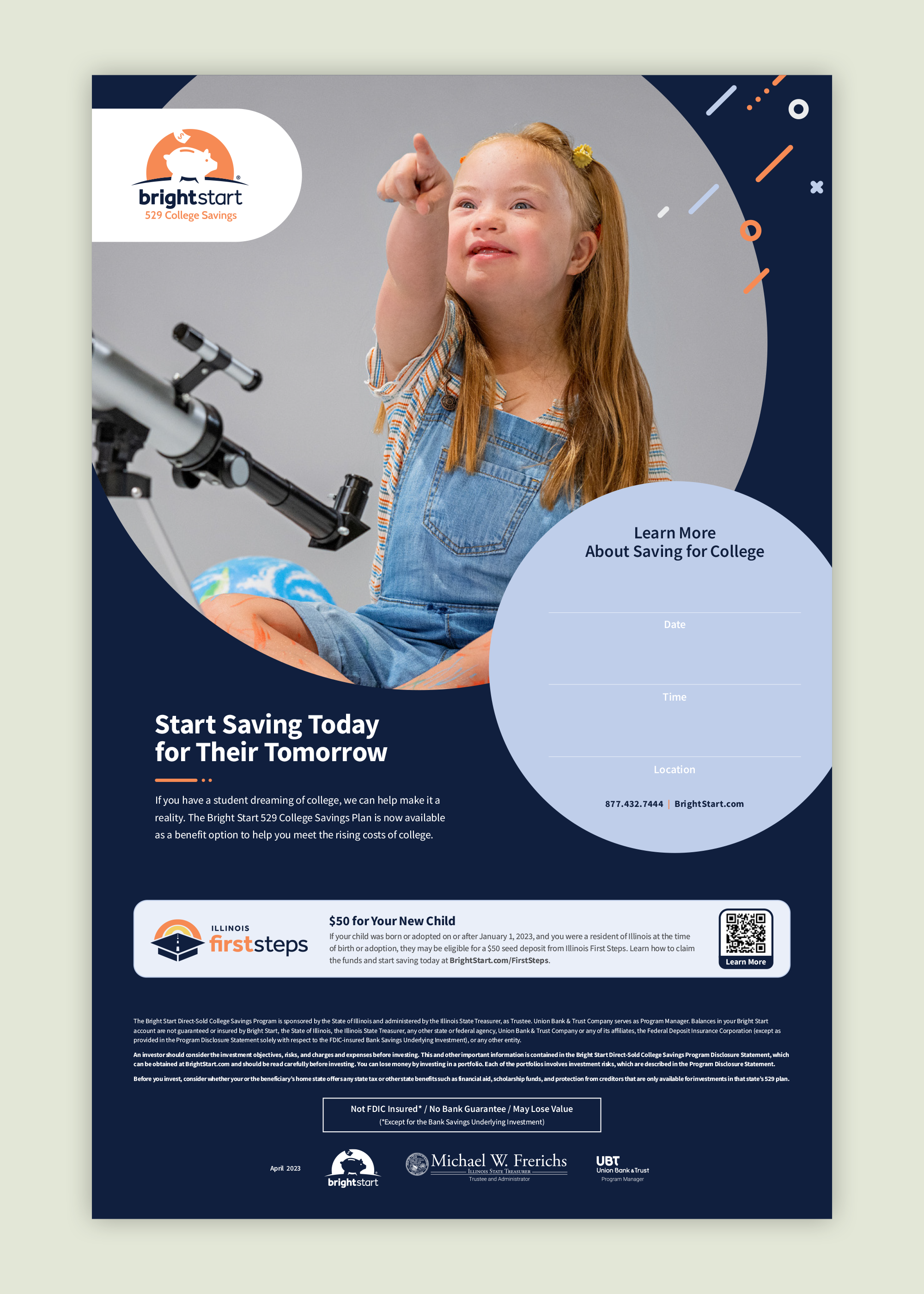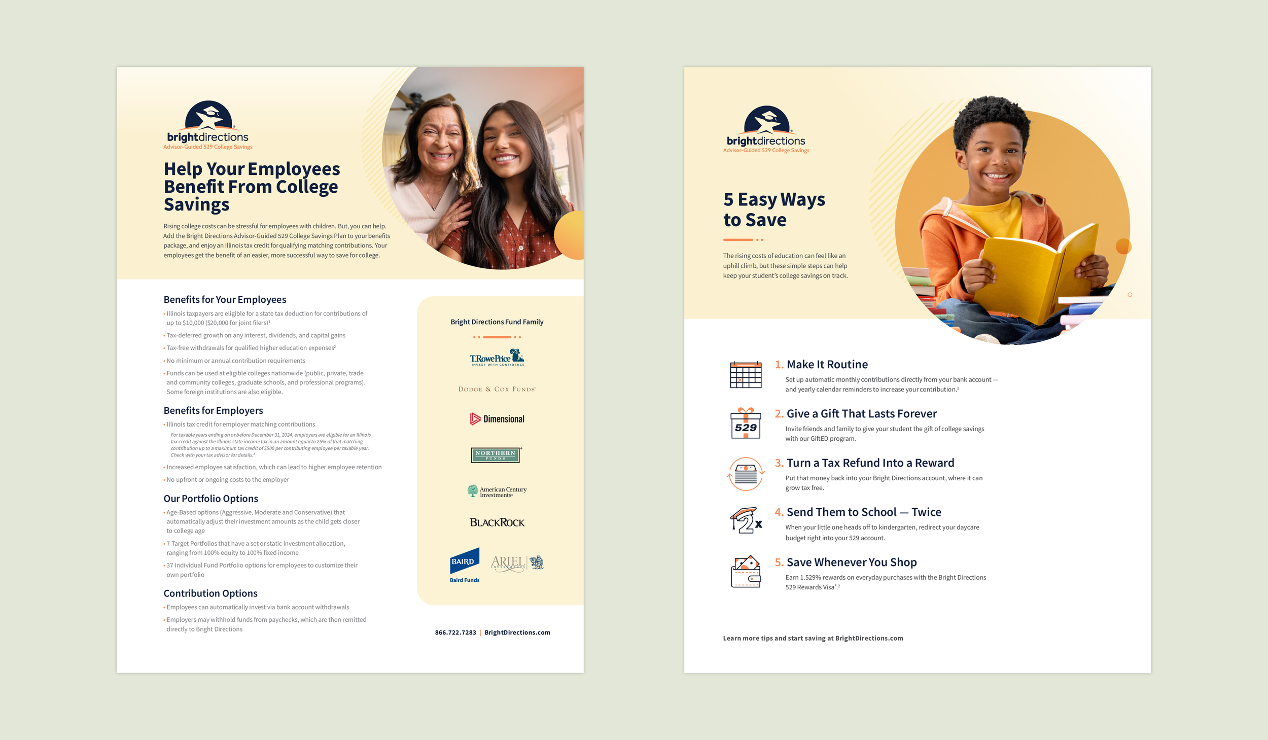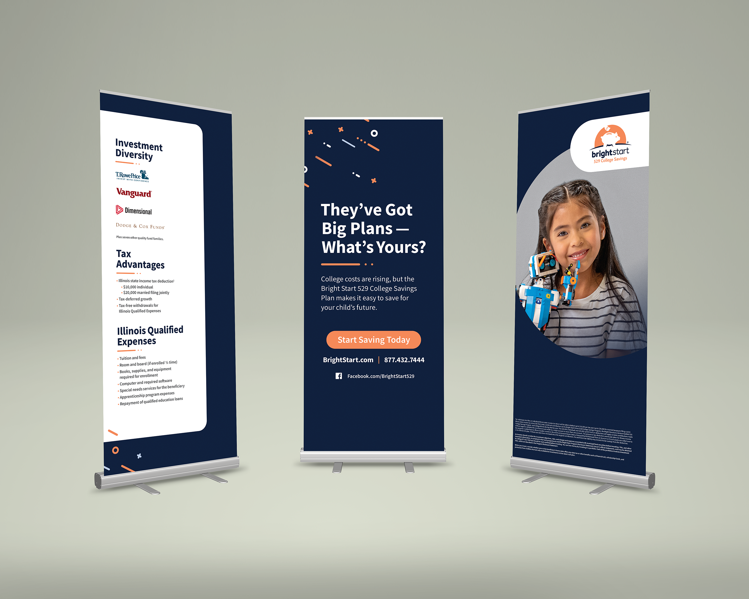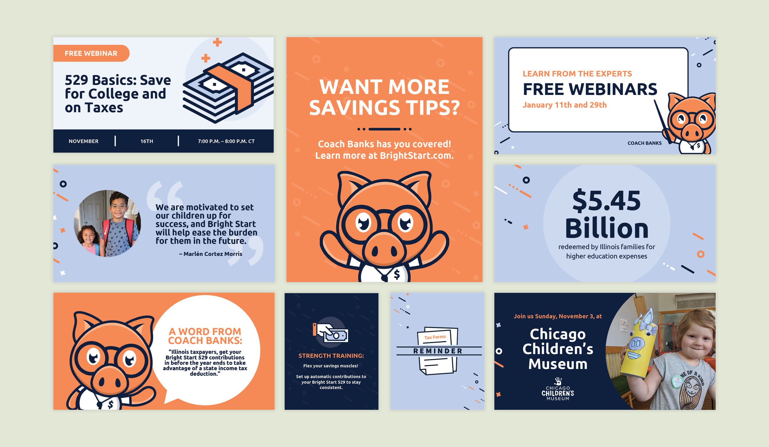 Getting parents to start thinking about college early isn’t easy—but Bright Start and Bright Directions make it possible as Illinois’ 529 plans. As part of a team, I designed quarterly newsletters, print collateral, and social media templates to create a unified visual presence across every brand touchpoint.