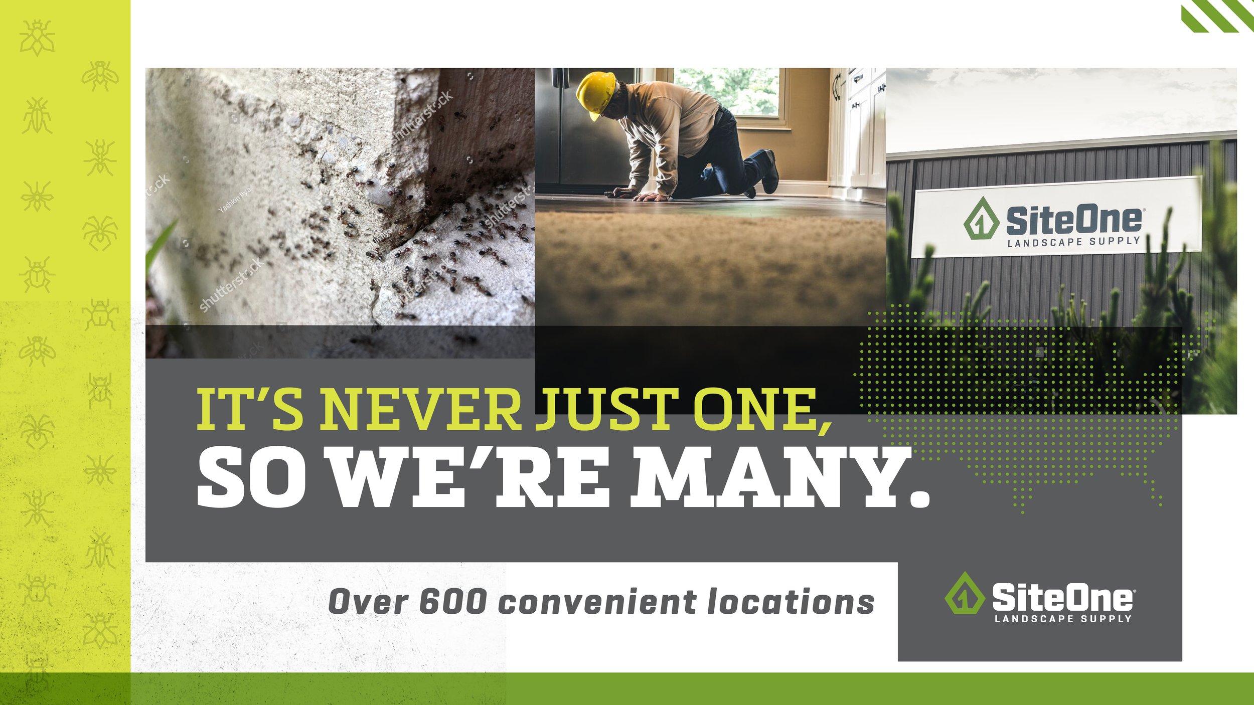 I rolled up my sleeves to shape the visual direction for two of SiteOne’s seasonal campaigns. The first focused on equipment, using bold stamped typography and pops of color to stop the scroll. The second tapped into the pest control category, combining vibrant palettes with overlapping shapes and geometric layouts to create a distinct look.